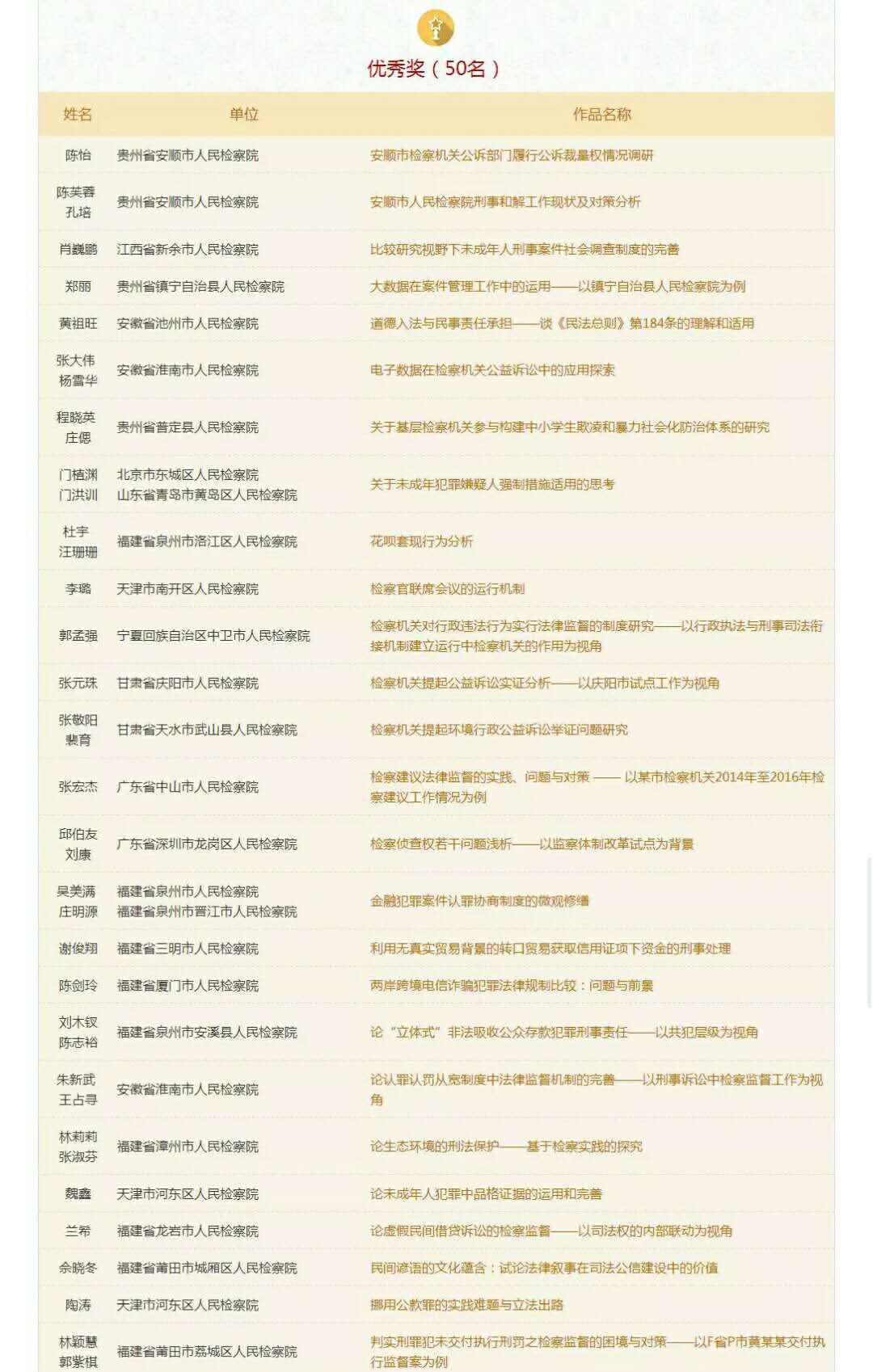 据悉,此次活动是经高检院领导批准,由高检院法律政策研究室与同方知网(北京)技术有限公司联合举办,以“加强法律理解与适用,塑造专业化检察官”为主题的有奖征文活动。据统计,在全国各级检察机关的积极参与下,共提交参赛论文914篇,为确保评审水平和质量,组委会对全部投稿论文均利用中国知网检测软件进行了原创性检测;邀请有关专家组成评审组,根据原创优先,对检察工作具有指导意义优先,论点新颖优先的原则,通过匿名评审、一稿三评、同题择优等环节,对参赛论文进行了认真评审。最终,评选出一等奖论文3篇,二等奖论文10篇,三等奖论文20篇,优秀奖论文50篇。
