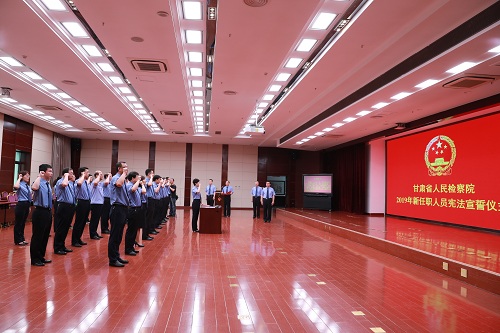宣誓仪式由副检察长李保岗主持,政治部主任赵小庚宣读参加宣誓仪式人员名单,随后,全体宣誓人员同唱《中华人民共和国国歌》,副检察长丁霞敏面对国徽、抚按《宪法》,带领32名2019年新任职人员进行了庄严宣誓。