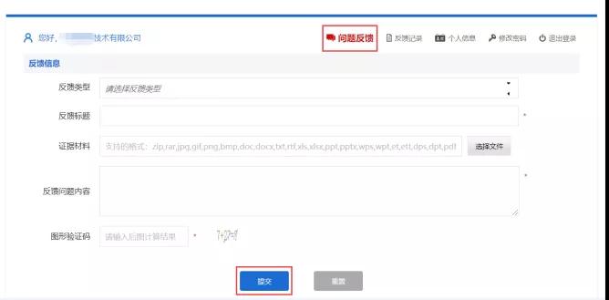 点击“问题反馈”,选择反馈类型----填写反馈标题----上传证据材料----填写反馈问题内容----输入图形验证码----点击提交。