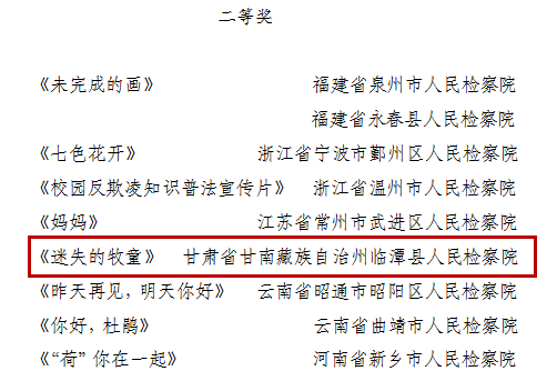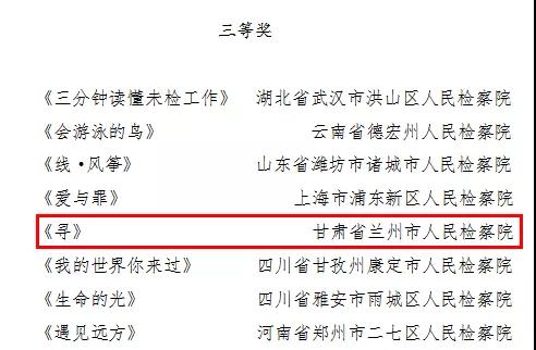 近日,最高人民检察院印发了《关于表扬检察机关“法治进校园”全国巡讲活动表现突出单位和突出个人的通报》和《关于首届全国未成年人检察微电影微视频微动漫评选获奖作品及单位的通报》,兰州市检察院、甘南州检察院、景泰县检察院被评为“法治进校园”全国巡讲活动表现突出单位,临潭县检察院原创微电影《迷失的牧童》荣获二等奖,兰州市检察院原创微电影《寻》荣获三等奖。