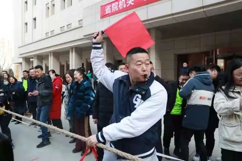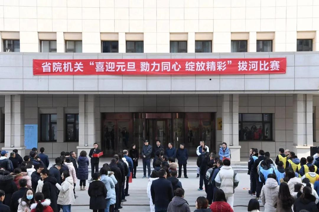 机关在省院篮球场举办“喜迎元旦 勠力同心 绽放精彩”拔河比赛。省院二级巡视员刘荣芳,二级高级检察官樊伟、齐世萍、石占全,特级检察官助理王丹晖在比赛现场为各支参赛队伍加油助威。省院政治部副主任王瑞成做赛前动员讲话,机关党委专职副书记叶茜主持比赛开幕式,比赛邀请了省体工二大队国家一级裁判员刘钰为裁判长。