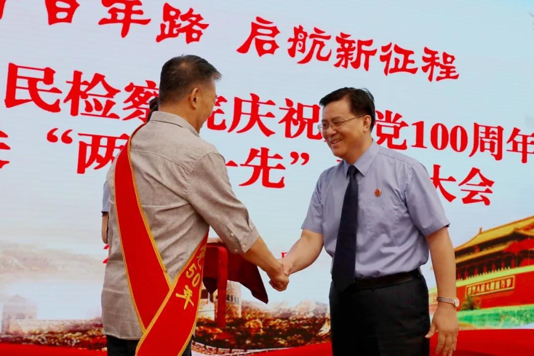 党组书记、检察长朱玉为4位老党员代表颁发“光荣在党50年”纪念章