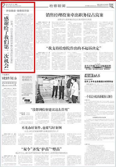 2021年8月2日,检察日报二版头条刊发新闻《“感谢给了我们第二次机会”——甘肃:出台实施细则审慎办理涉民企案件》。