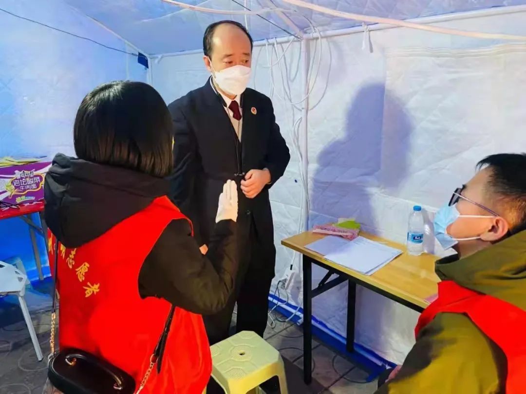 “核酸检测时请大家有序排队,间隔一米,耐心等待”“麻烦出示一下今天的行程码、健康码,核实一下您的核酸检测信息”这是该院志愿者干警在社区提供服务的场景,志愿者们协助配合社区开展封控卡点执勤管理、值班值守、体温监测、维护秩序、排查登记、生活保障、物质配送、环境消杀、困难群体帮扶、疫情防控政策宣传等工作。值班查验点上,值班值守干警认真查验、不漏一人;核酸检测点上,维持秩序、避免混乱……