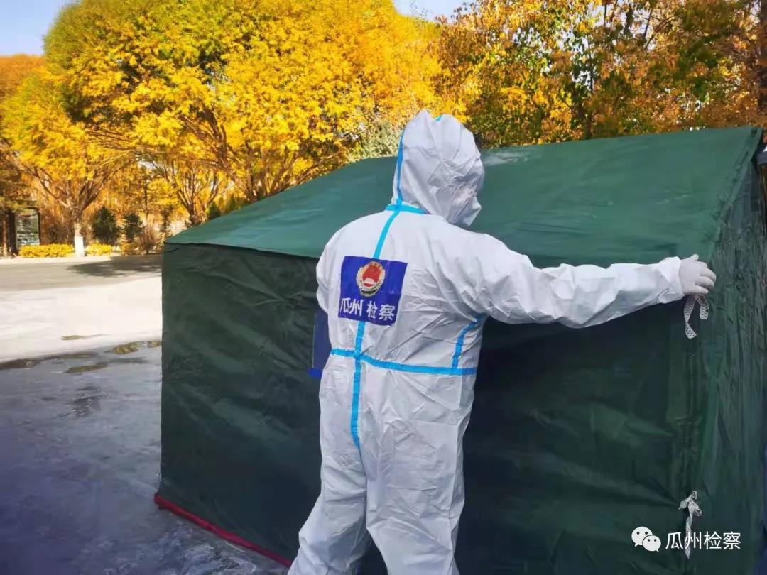 “我院需选派一名干警到‘区级疫情隔离点’执行相关任务,现请有意愿的干警群里报名。”“我!”10月26日,兰州市红古区检察院干警杨文军作为一名退伍军人,主动请缨到隔离点值守。“为避免防疫物资浪费,我们防护服一穿就是8个多小时,遇上逐楼层消杀或者搬运防疫物资的任务,身上的衣服是湿了干,干了湿,但只要想到我的工作做得细一点,群众受到的威胁就少一点,再苦再累也值得。”杨文军说。