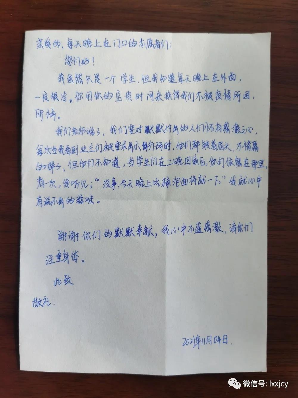 “当学生们夜晚回家后,你们依然在那里,有一次,我听见‘没事,今天晚上吃桶泡面将就一下’,我就心中有说不出的滋味”。夜晚23时,陇西县检察院疫情防控值守点干警像往常一样查验着通行证,突然,一名下晚自习回家的学生将一封折叠的信件塞到了执勤干警手中,然后就匆忙跑开了,借着值守点的微光,执勤干警读到了上面这段话。正如“澳彩团队”微信群所说,“在这个寒冬,一封感谢信,让我们的执勤夜不再寒冷”。