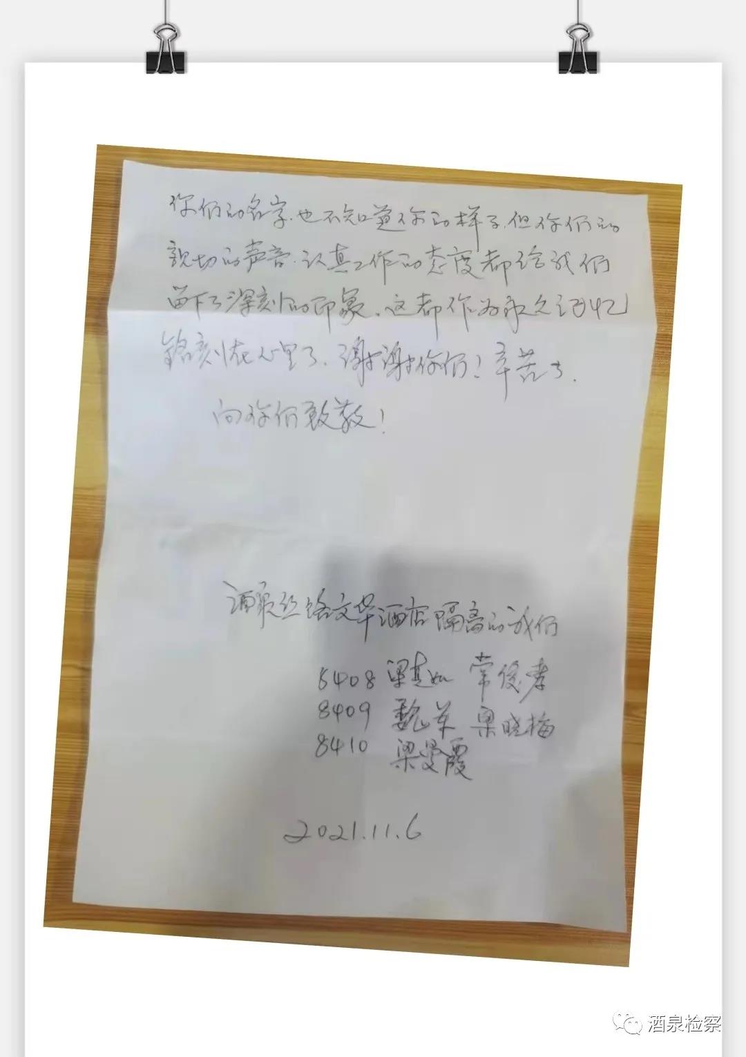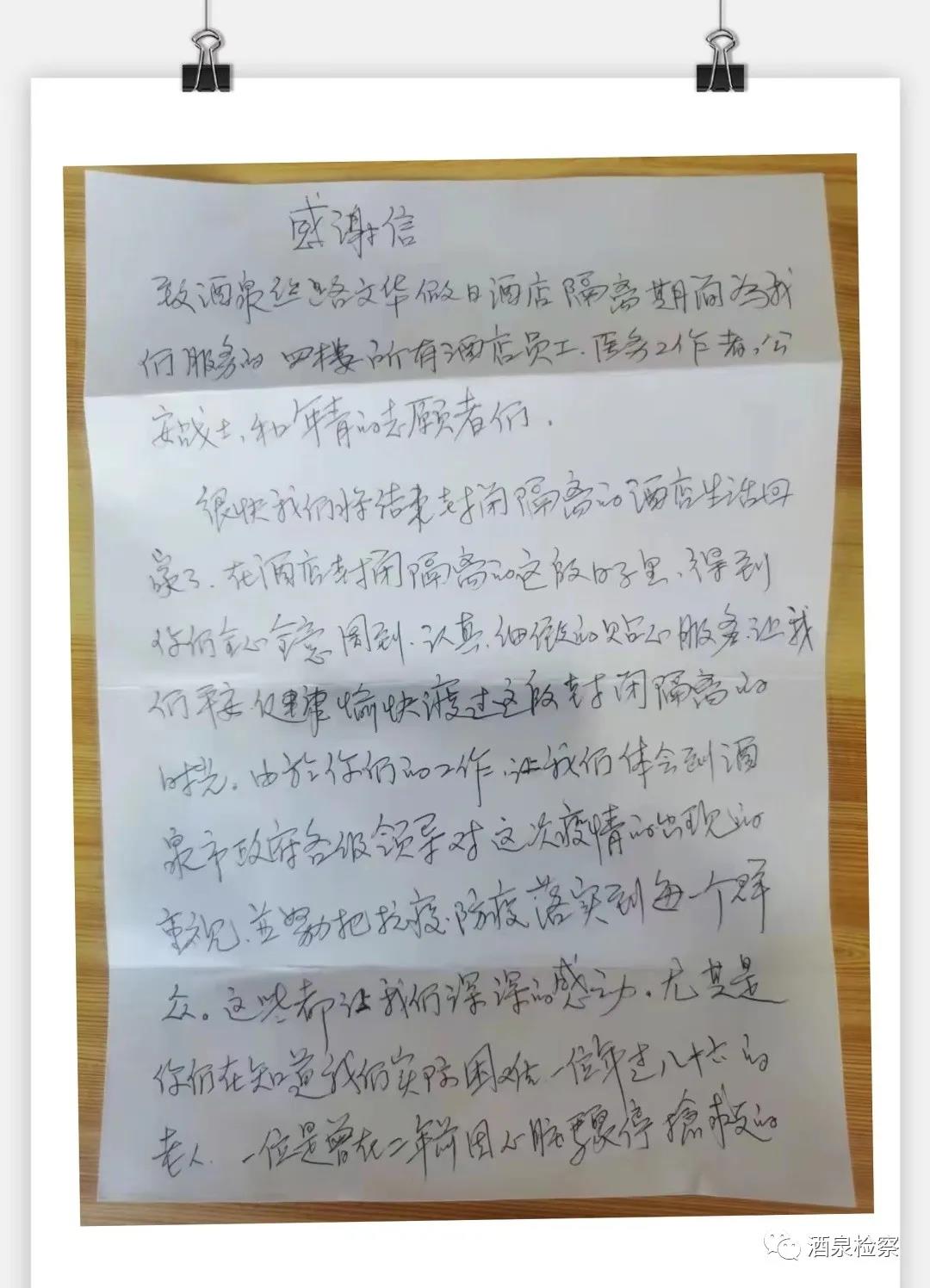 “你们每天及时帮忙收取垃圾,每天把早午晚三餐及时送到房间,还不怕麻烦……”“虽然天天见面,但我不知道你们的名字,也不知道你们的样子,但你们亲切的声音、认真工作的态度都给我们留下了深刻的印象……谢谢你们,辛苦了。”这是酒泉市检察院包抓的一个集中隔离点,隔离人员在解除隔离后致志愿者的感谢信。
