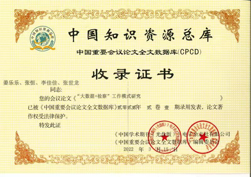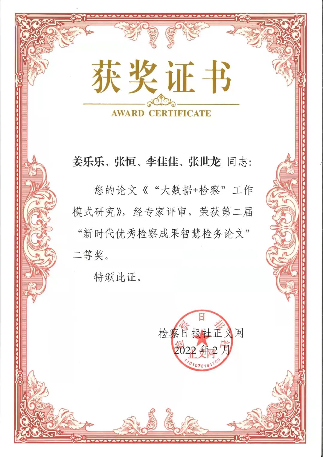 报送的《“大数据+检察”工作模式研究》荣获二等奖,并被《中国知识资源总库中国重要会议论文全文数据库》收录。