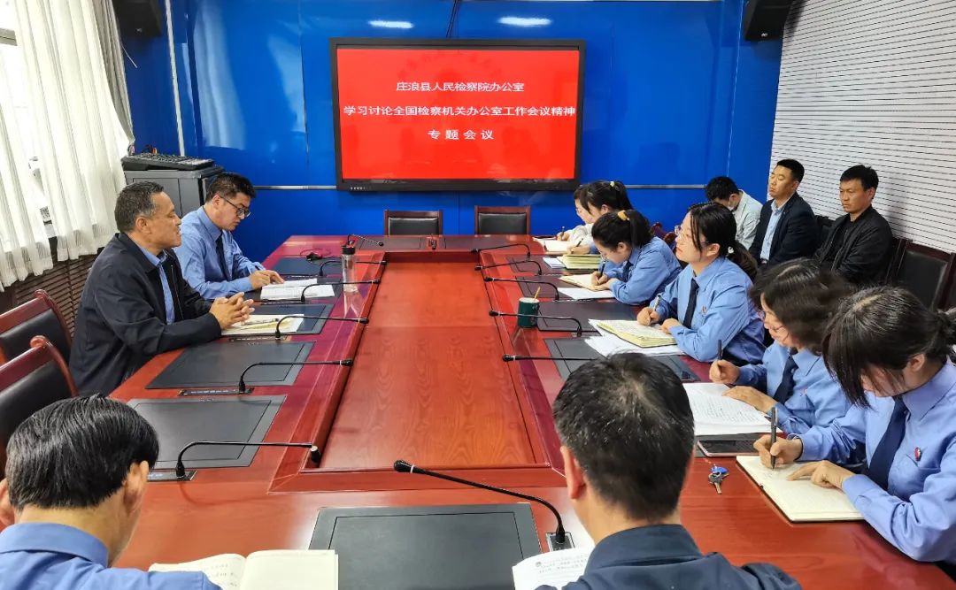 5月19日下午,庄浪县检察院党组书记、检察长王军雄主持召开专题会议,学习贯彻张军检察长在全国检察机关办公室工作会议上的讲话精神。与会人员围绕检察工作和队伍建设中存在的不足逐一交流发言,讨论贯彻落实措施。会议指出,要树立“一体”履职的理念,实现综合工作服务业务工作、业务工作助推综合工作新模式,共同提高检察工作整体质效;要明确服务全院的定位,协调组织、认真履职,实现检察工作双赢多赢共赢;要培养“一专多能”的人才,力争培养一批“开口能说、提笔能写、遇案能办、办事能成”的复合型高素质人才;要坚持廉洁自律的作风,筑牢思想防线,努力锻造一支忠诚干净担当的检察铁军。