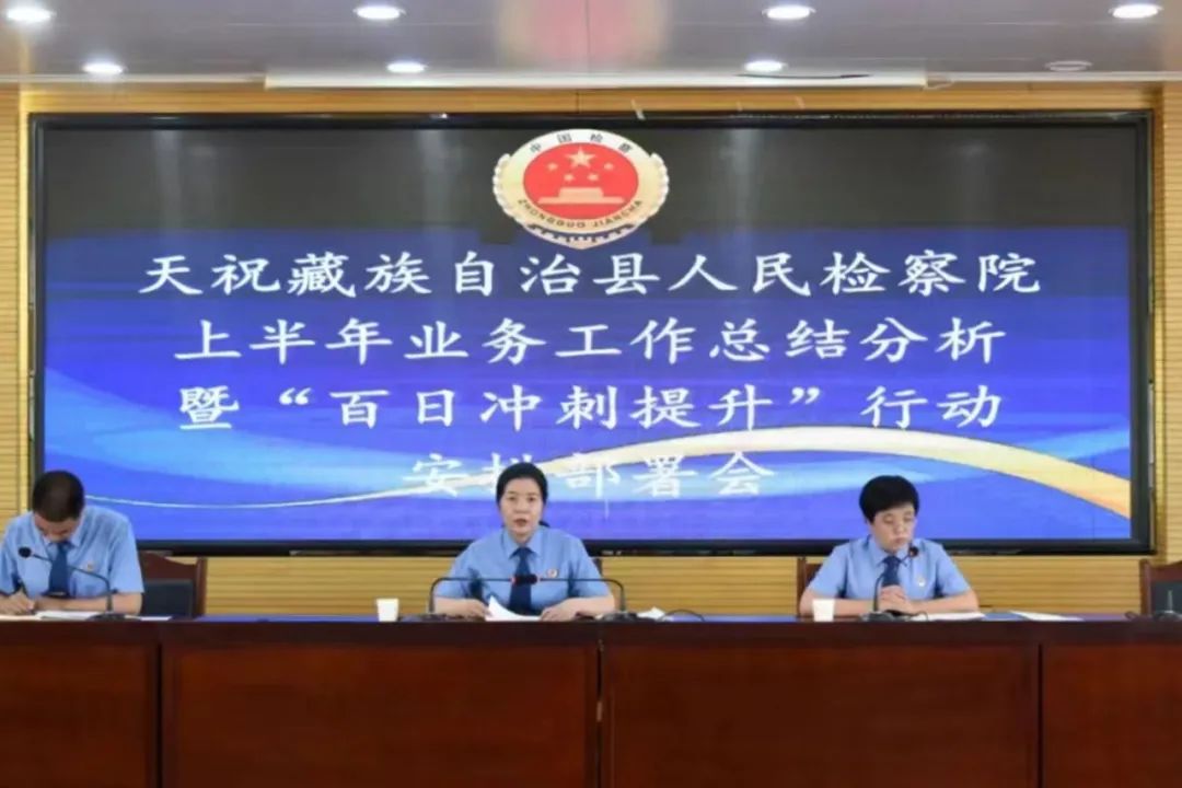 7月14日,天祝县检察院召开上半年业务工作总结分析暨“百日冲刺提升”行动安排部署会议,各部门就工作开展情况作交流发言,针对短板查摆问题、剖析原因,提出下一步工作思路和措施。分管院领导进行点评分析,明确第三季度工作目标和要求。会议要求,全院干警坚持问题导向、目标导向、效果导向相结合,对照“业务指标做优、刚性任务落实、专项任务完成”要求,实施领导包抓、挂图作战、精准作业,确保“百日冲刺提升”行动取得实效。