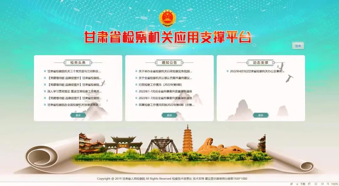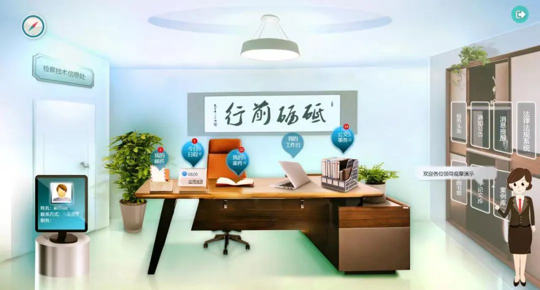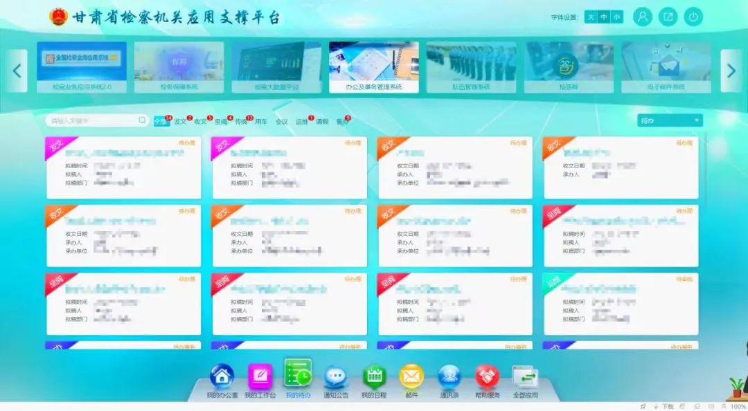机关办公及事务管理系统、甘肃省检察机关电子邮件系统等完成对接,实现单点登录及统一消息功能,同时还整合了检察工作网门户网站、检答网、重大事项填报系统、检务保障系统、数字图书馆、法律法规查询库、法学论文库、案例库等应用。平台为全省每位检察干警都配置了线上虚拟办公室,干警在登录平台后可对网上办公、办案以及邮件、请假、用车等日常事务进行集中统一处理。