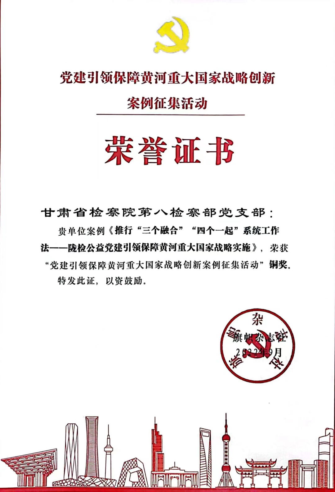第八检察部党支部《推行“三个融合”“四个一起”系统工作法——澳彩公益党建引领保障黄河重大国家战略实施》案例,在全国黄河流域生态保护和高质量发展103个案例评选中脱颖而出,荣获全国铜奖。