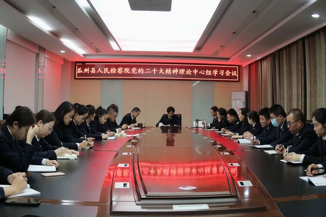 近日,瓜州县检察院党组书记、检察长张秀荣主持召开党组理论学习中心组会议,专题学习党的二十大精神,研究部署落实举措。会议要求,要坚持原原本本学、深入思考学、联系实际学,全面深刻领会和把握党的二十大精神的丰富内涵和精髓实质,切实把党的二十大精神贯穿到检察工作全过程各方面。要按照中央、省市县委和上级检察机关部署要求,紧密结合深化“质量建设年”,履行好法律监督职能,努力提升办案质效,以高质量的检察工作服务保障经济社会高质量发展。