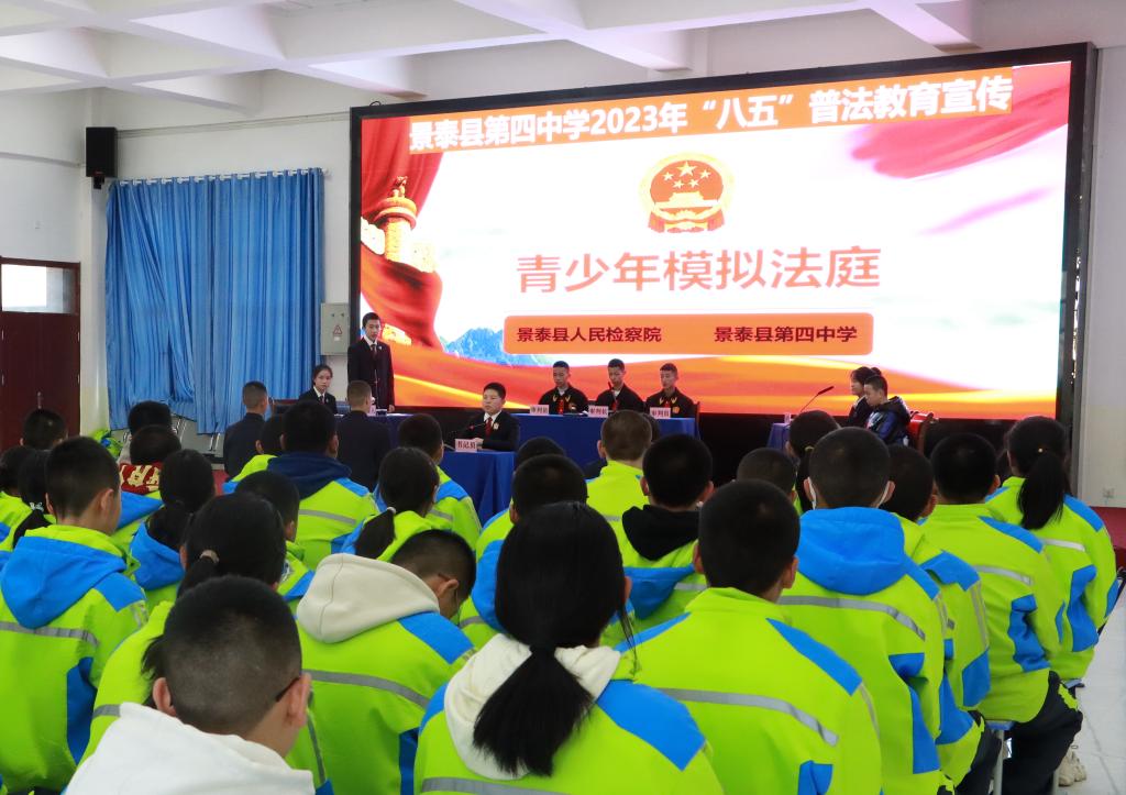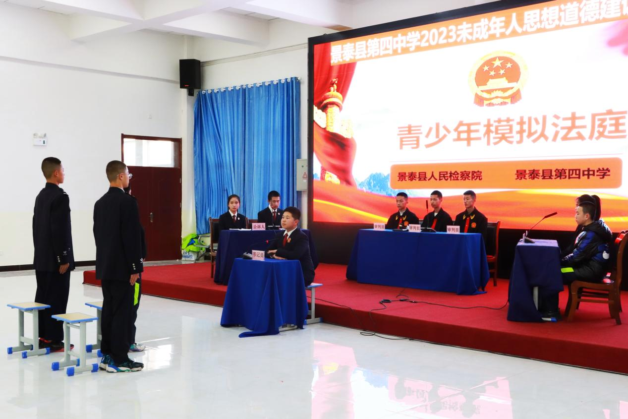2023年11月21日,景泰县检察院联合景泰四中举办“青少年模拟法庭”活动,12名学生分别饰演审判长、审判员、书记员、公诉人、辩护人、被告人、法警等角色。此次活动按照公诉人宣读起诉书、法庭调查、法庭辩论、被告人最后陈述、法庭教育和法庭宣判的审理程序最大限度还原案件审理全过程,以案释法引导在场同学身临其境感受法律的公平公正,教育同学们严于律己、明辨是非,做新时代知法、懂法、守法的好少年。