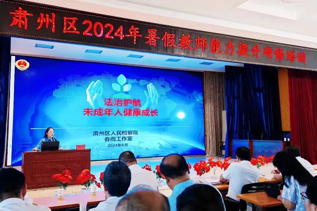 酒泉市肃州区检察院“春雨工作室”检察官受邀在区“2024年暑期教师能力提升研修培训班”上,以“强制报告制度”为主题作专题法治讲座,围绕强制报告制度、未成年人犯罪预防、未成年人“六大保护”等方面进行详细讲解,助力教职人员树立学法明理、依法执教的法治观念。