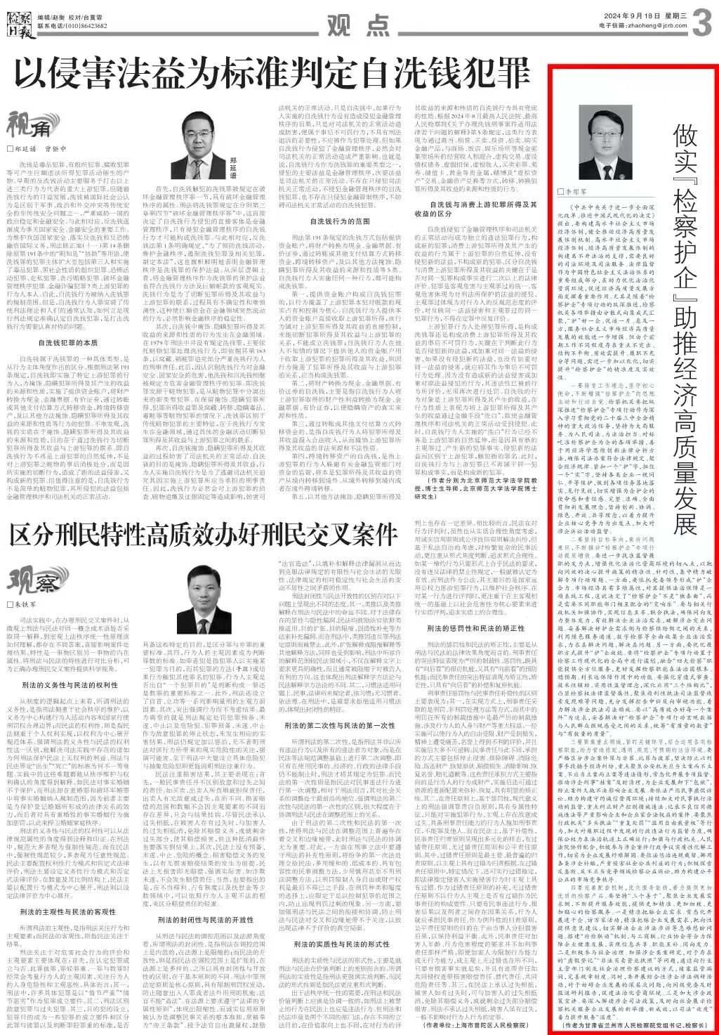 2024年9月18日,检察日报刊发甘肃省兰州市检察院李郁军撰写的文章《做实“检察护企”助推经济高质量发展》。