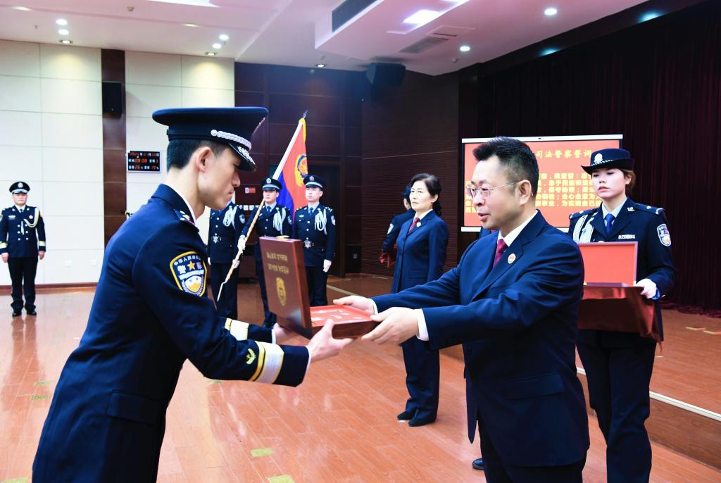 5名首授警衔的司法警察代表,从沈涧手中接受警衔,开启新的履职征程。