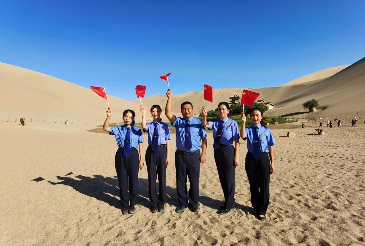 2021年10月1日,敦煌市检察院干警在月牙泉旁为祖国庆生,他们牢记公益初心使命,始终担当付出,守护大美敦煌。