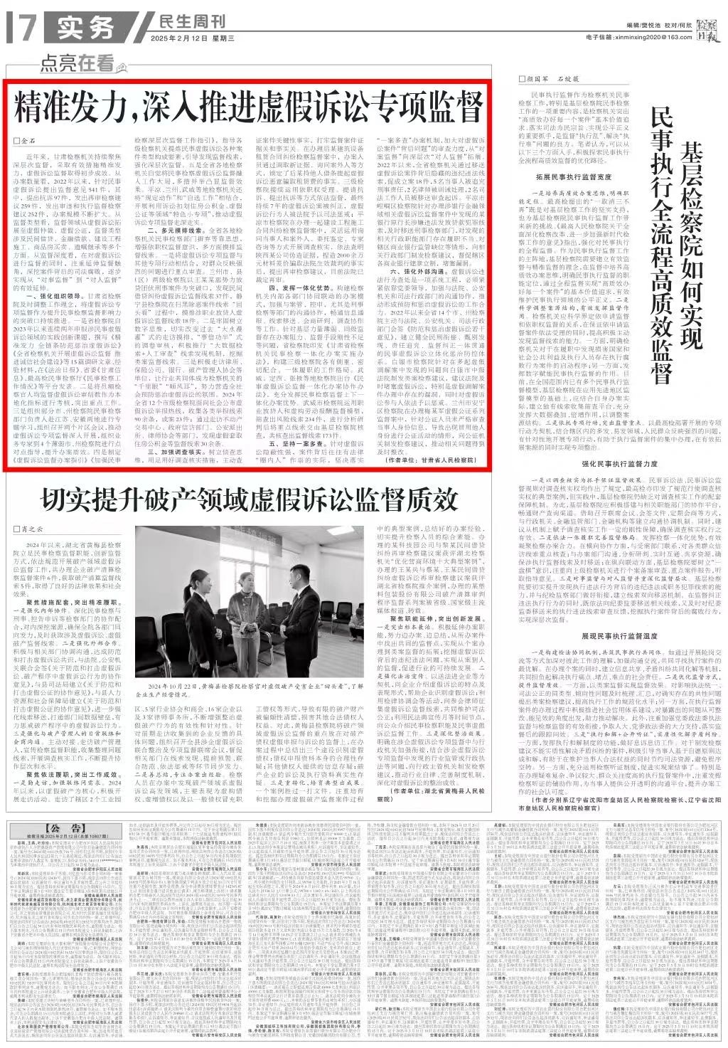 2025年2月12日,检察日报民生周刊刊发理论文章《精准发力,深入推进虚假诉讼专项监督》。