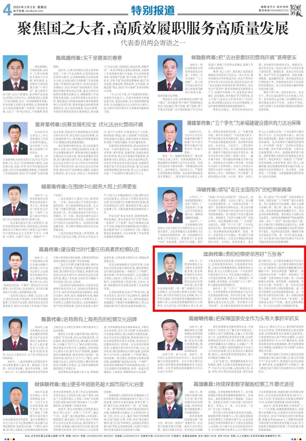 2025年3月2日,检察日报《聚焦国之大者,高质效履职服务高质量发展》特别报道刊发《沈涧代表:勇担检察使命答好“五张卷”》。