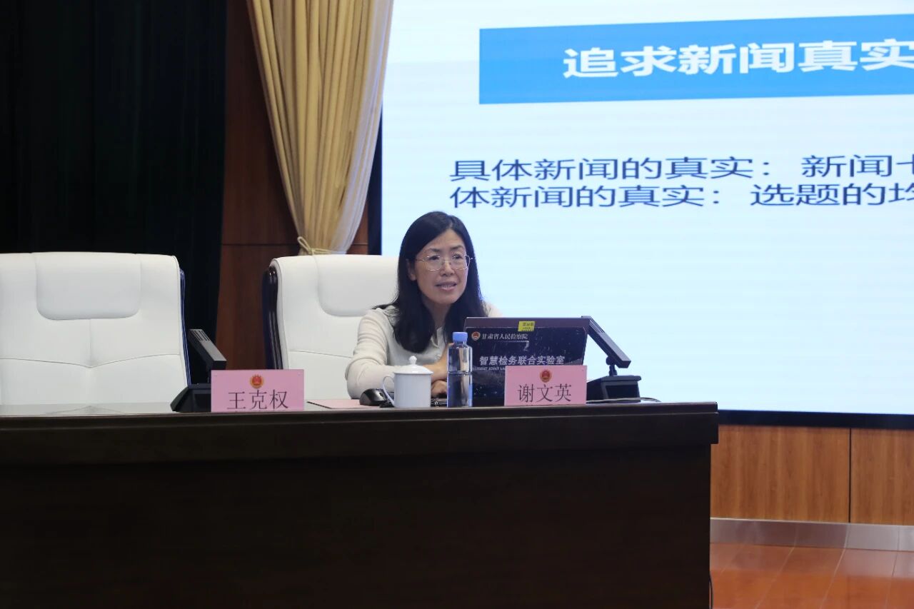“挖掘工作亮点不是机械问答,而是要像聊天一样探寻检察工作背后的故事,可以借鉴‘卖盒饭理论’,把最精华的内容首先直观呈现给大家……”检察日报全媒体采访部副主任谢文英以其丰富的采编经验,生动讲授“新闻记者的基本功——采访与写作”,手把手教大家消息、通讯的采写方式、注意事项,如何从检察办案的“富矿”中找到打动人心的细节,让法治故事“活”起来。