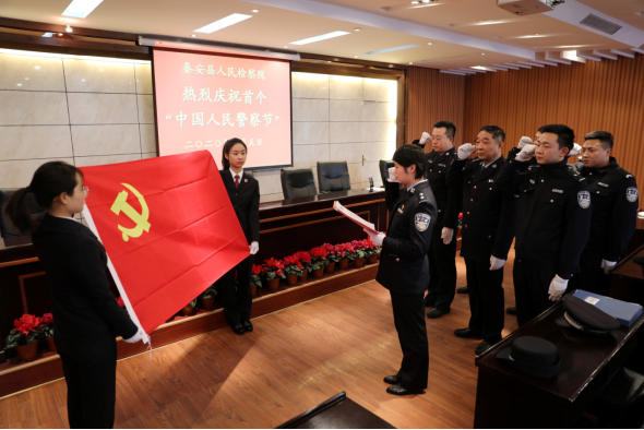 1月6日起,秦安县院开展了多种形式的活动庆祝首个人民警察节,营造了浓厚的节日氛围。6日下午,该院组织干警重温入党誓词和入警誓词。干警们警容严整、精神饱满、目光坚定、士气高昂,面向党旗、警旗,举起右手、庄严宣誓。宣誓结束后,组织召开座谈会,与会干警都进行了热情的发言。座谈会后,全体干警观看了专题教育片《光荣的时刻》。干警们纷纷表示,今后将更好地担负起党和人民赋予的新时代职责使命,坚决捍卫政治安全,全力维护社会安定,切实保障人民安宁。给党和人民交上一份满意的答卷,向首个人民警察节致敬和庆祝,以优异成绩回馈党中央的关心关爱!
