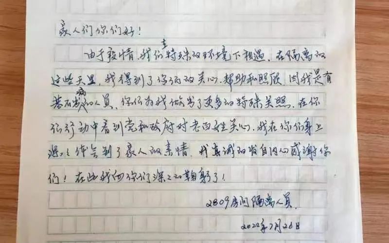 写下这封感谢信的,是入住隔离酒店2809房的李先生,因系密切接触者,被转运至隔离酒店进行医学观察。