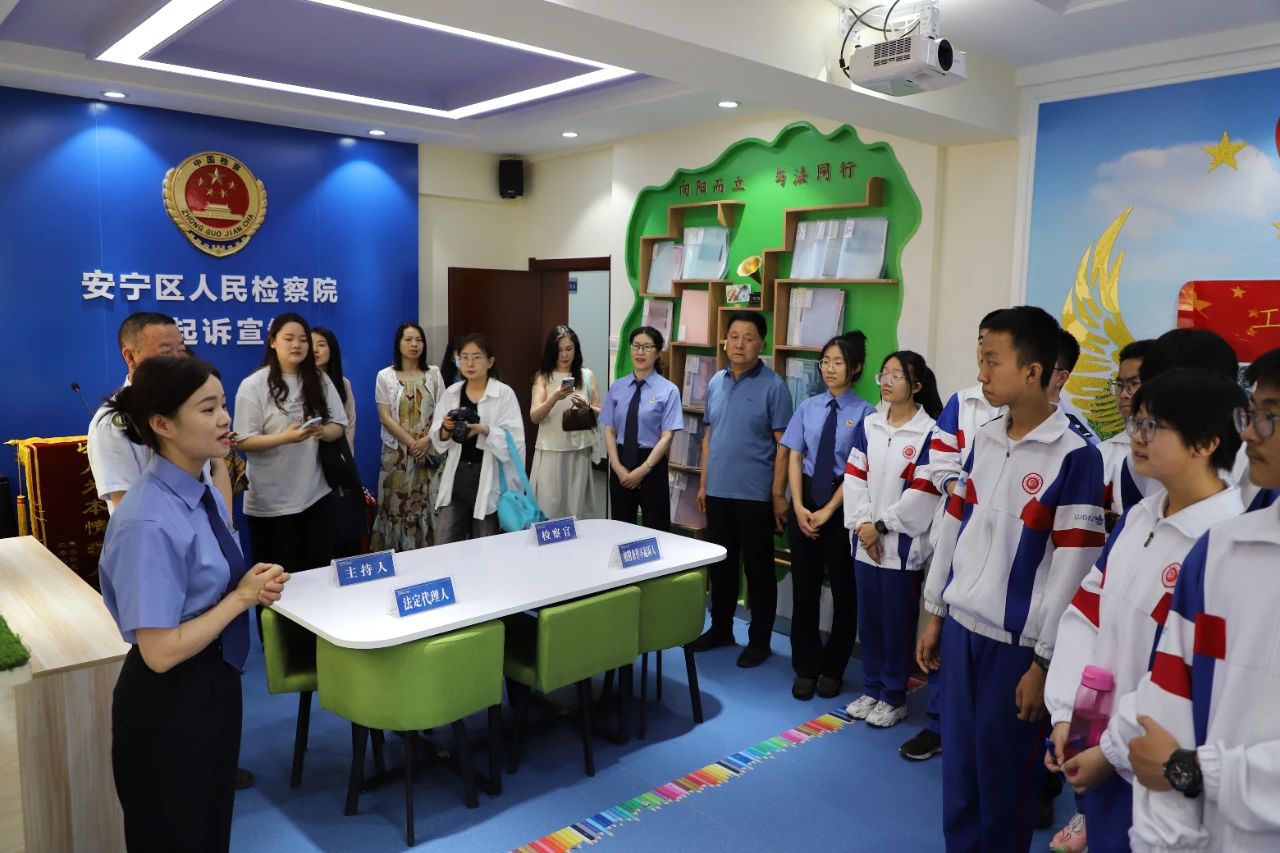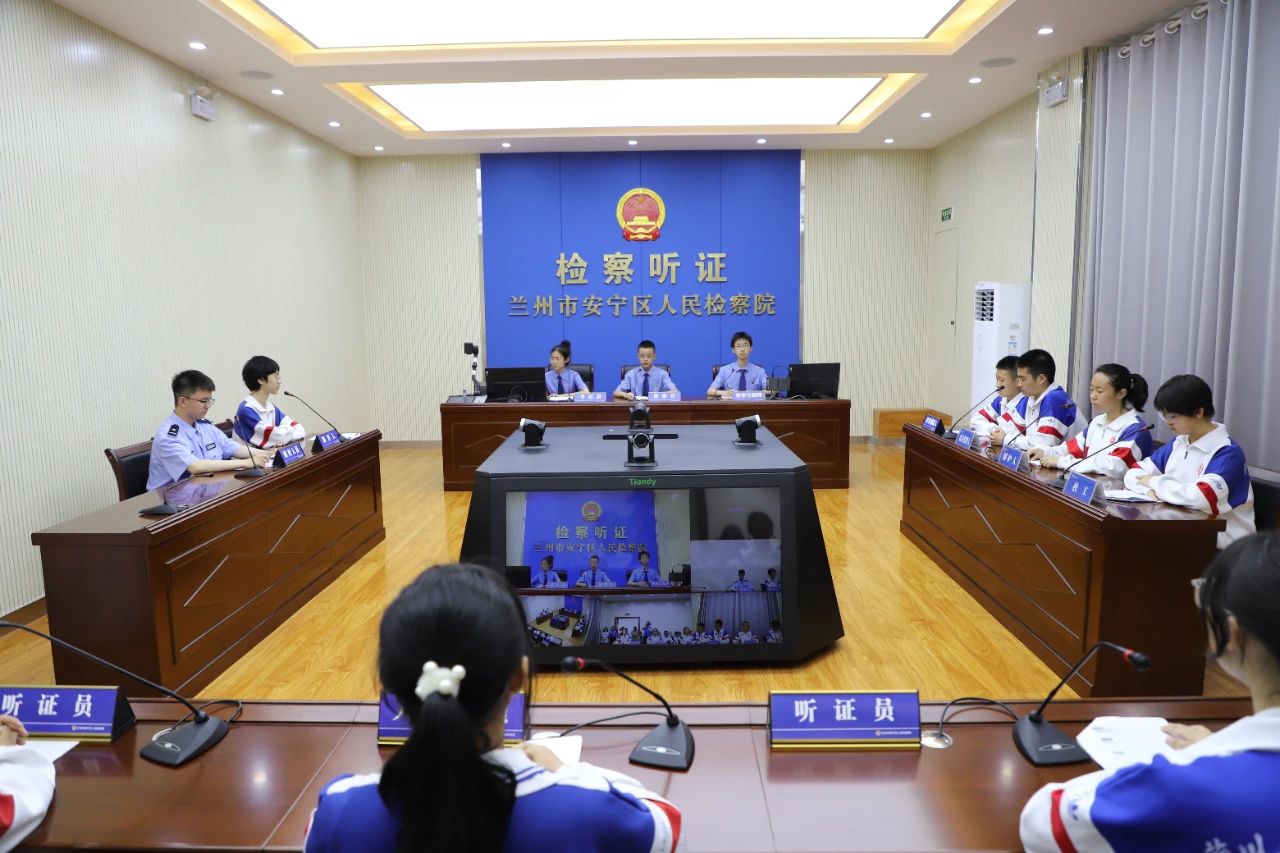 活动中,兰州市安宁区检察院组织兰州交通大学附属中学第一分校的学生召开模拟“听证会”,学生们分别扮演检察官、侦查人员、辩护人、嫌疑人、听证员、司法社工等角色,就一起未成年人犯罪案件展开讨论,完整再现了检察听证全过程。