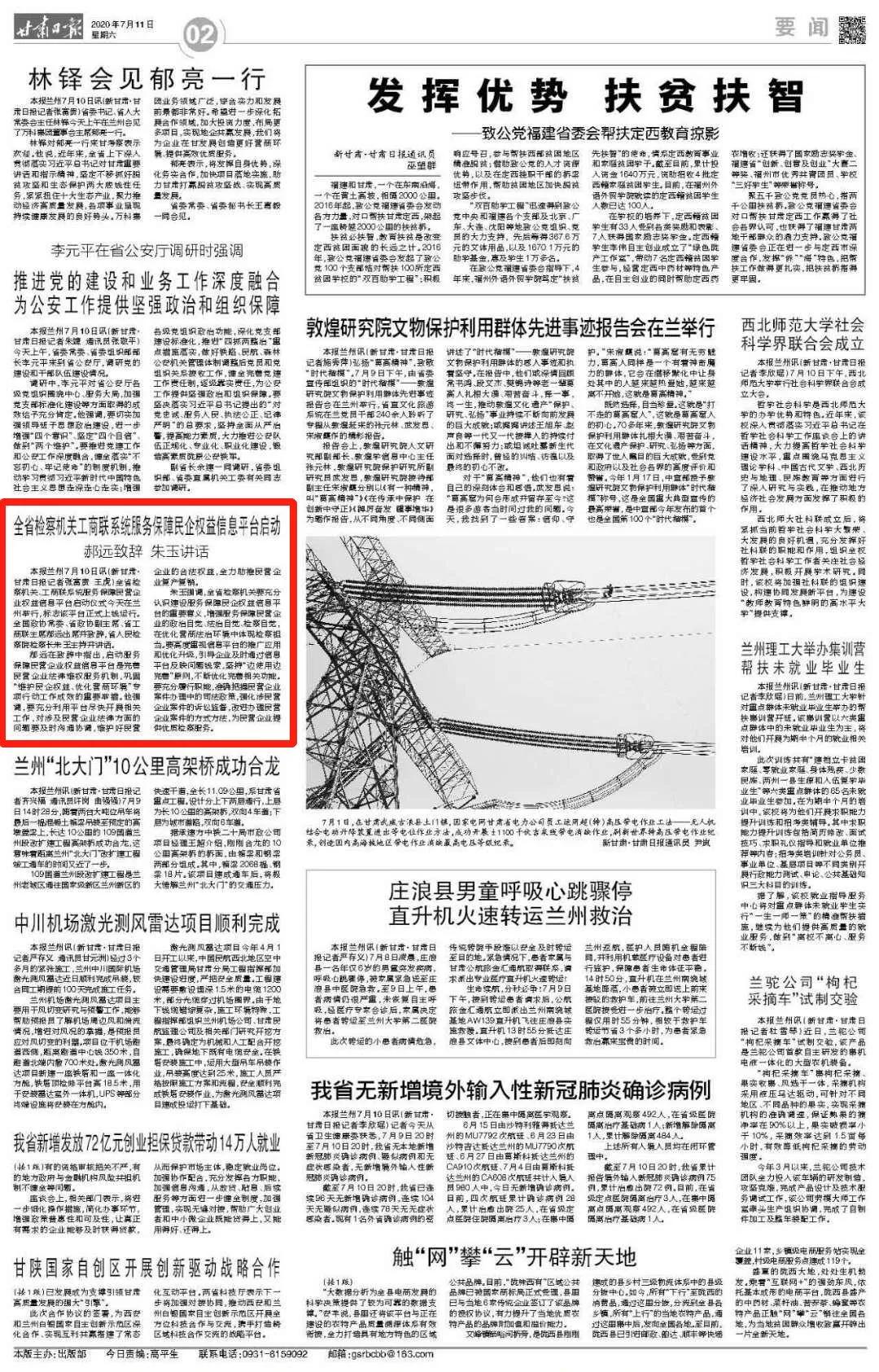 2020年7月11日甘肃日报刊发《全省检察机关工商联系统服务保障民企权益信息平台启动》一文。