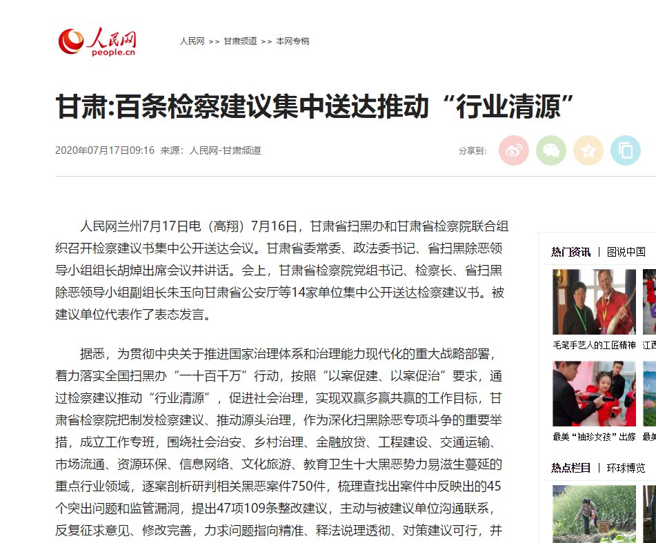 2020年7月17日人民网刊发《百条检察建议集中送达推动“行业清源”》一文。