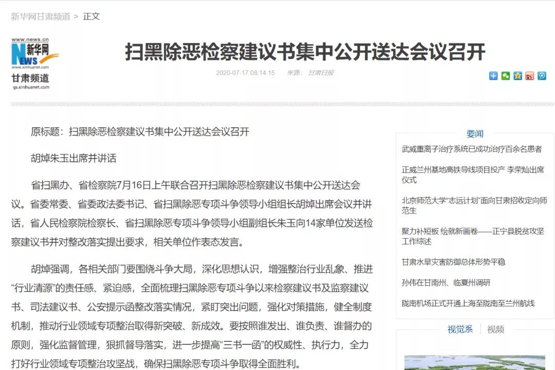 2020年7月17日新华网刊发《扫黑除恶检察建议书集中公开送达会议召开 》一文。