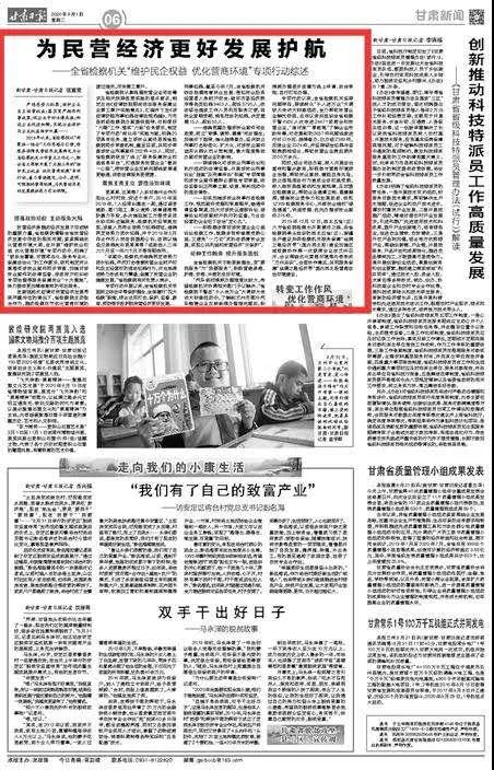 2020年9月1日甘肃日报刊发《为民营经济更好发展护航——全省检察机关“维护民企权益 优化营商环境”专项行动综述》一文。