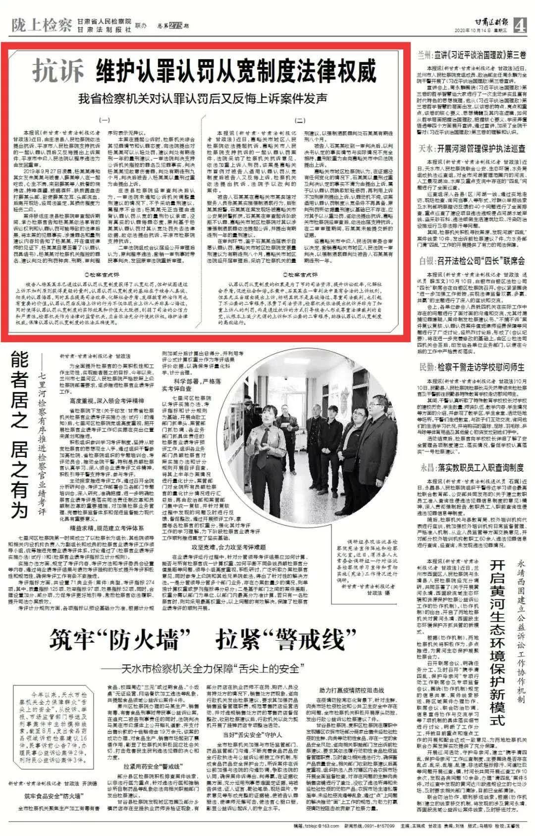 2020年10月14日甘肃法制报刊发《抗诉 维护认罪认罚从宽制度法律权威 我省检察机关对认罪认罚后又反悔上诉案件发声》一文。