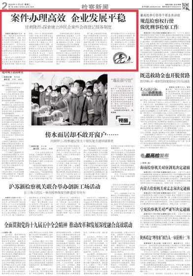 2020年11月3日检察日报2版头条刊发《案件办理高效 企业发展平稳——甘肃陇西:探索建立涉民企案件会商登记报备制度》一文。