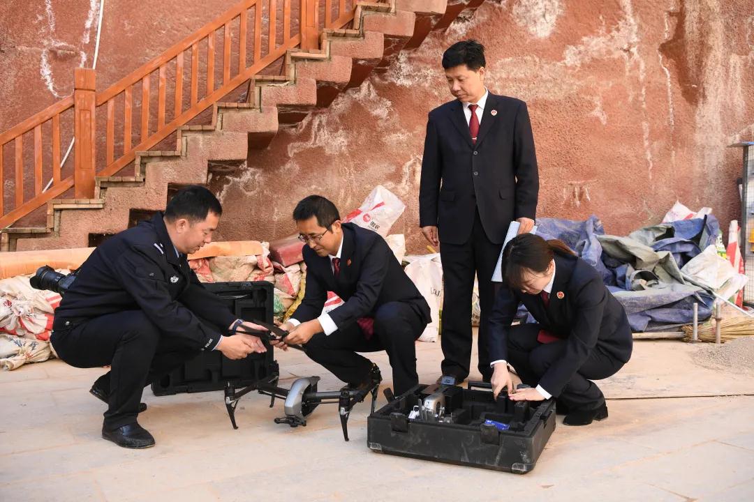 武威市检察院干警在文物保护现场运用无人机航拍取证。