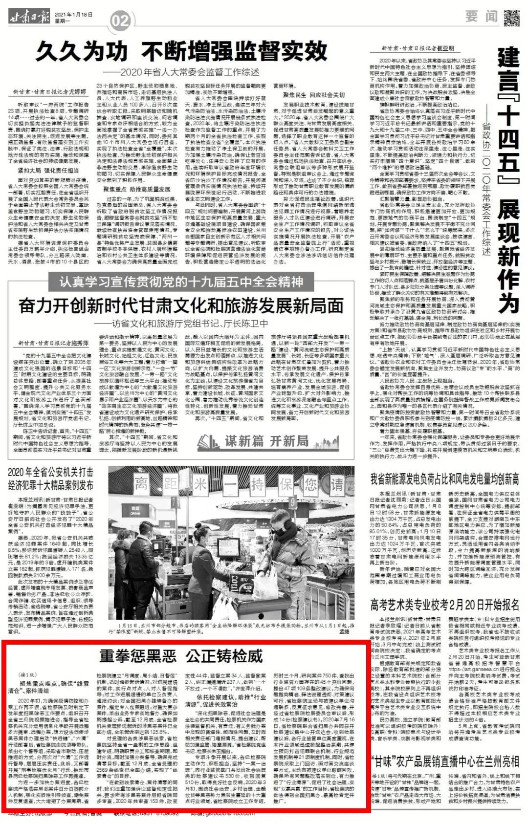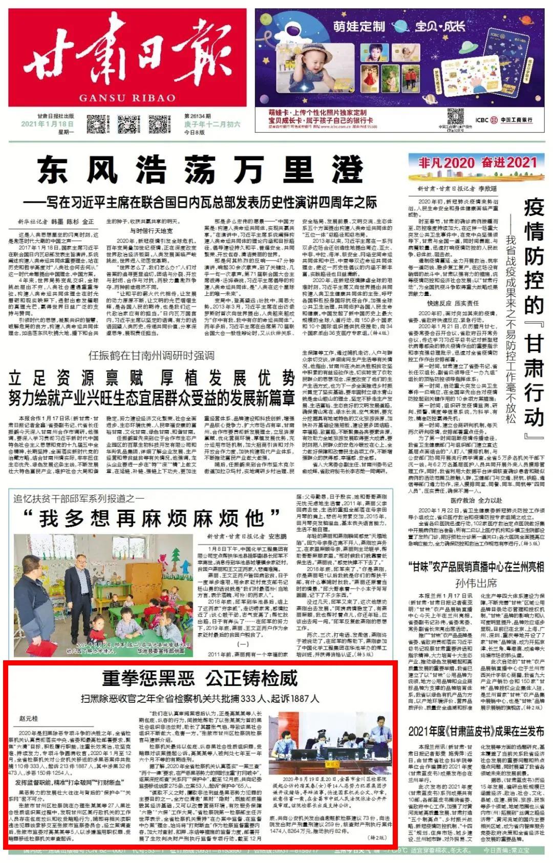 2021年1月18日甘肃日报头版、2版刊发《重拳惩黑恶 公正铸检威——扫黑除恶收官之年全省检察机关共批捕333人、起诉1887人》一文。