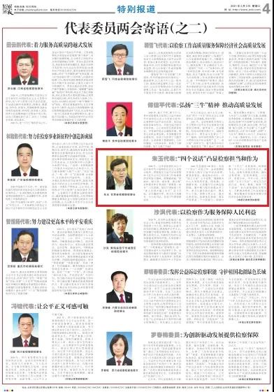 2021年3月3日《检察日报》四版刊发《朱玉代表:“四个说话”凸显检察担当和作为》一文。