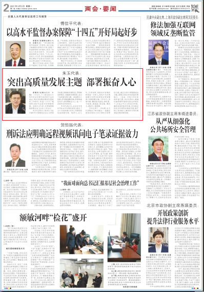 2021年3月8日《检察日报》2版刊发《突出高质量发展主题 部署振奋人心》一文。