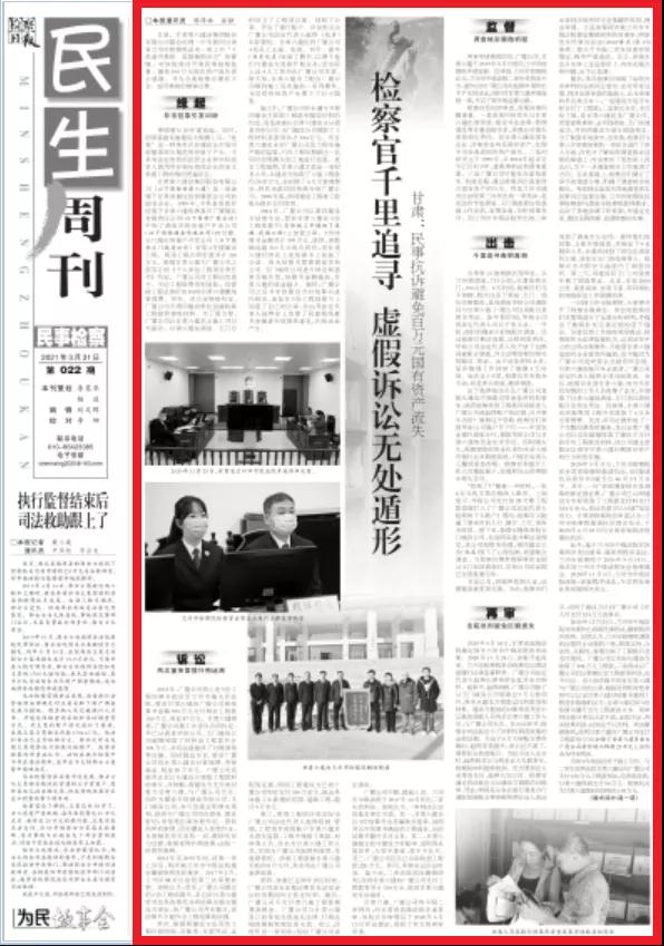 2021年3月31日检察日报5版刊发《甘肃:民事抗诉避免百万元国有资产流失——检察官千里追寻 虚假诉讼无处遁形》一文。