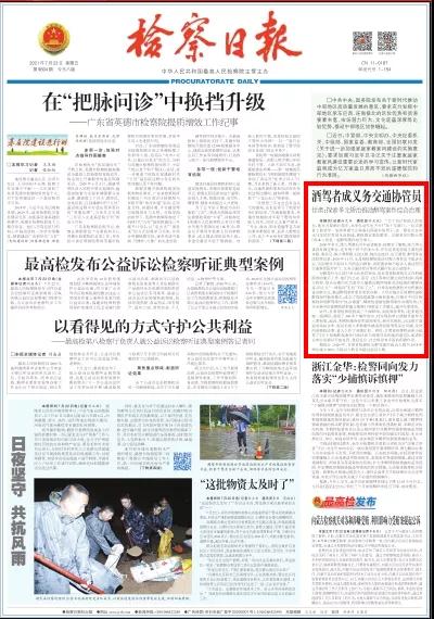 2021年7月23日,《检察日报》头版刊发《酒驾者成义务交通协管员——甘肃:探索多元矫治推动醉驾案件综合治理》一文。