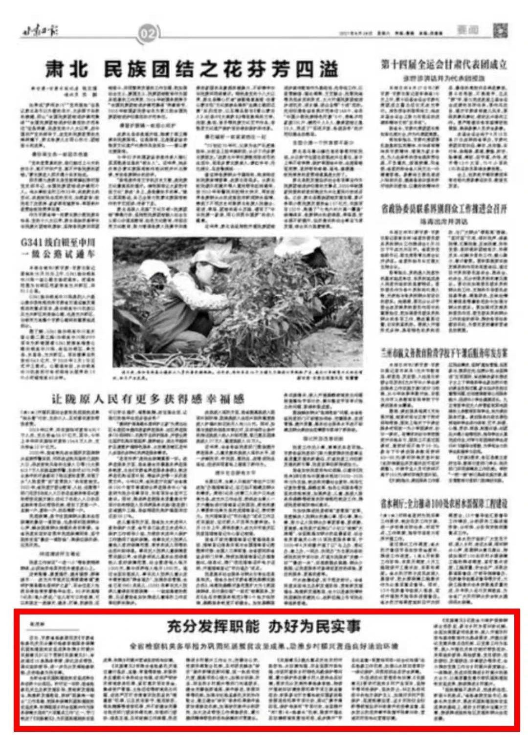2021年8月28日,甘肃日报二版刊发新闻《充分发挥职能 办好为民实事——甘肃省检察机关多举措为巩固拓展脱贫攻坚成果、助推乡村振兴营造良好法治环境》。