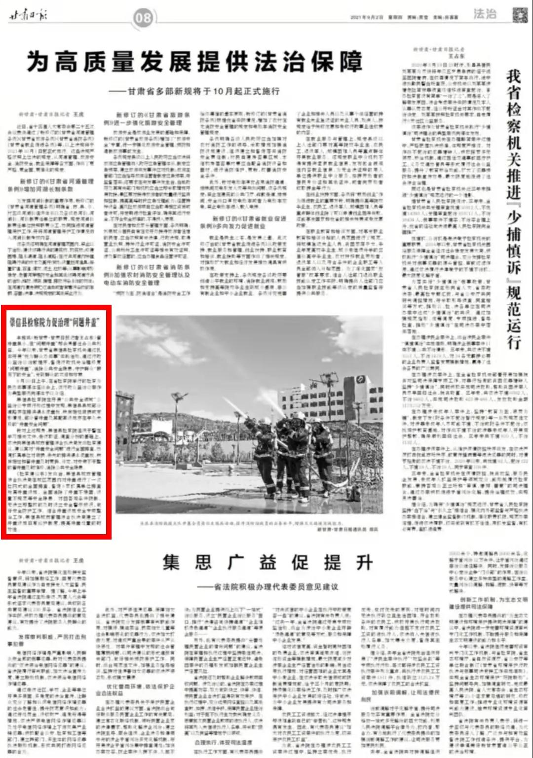 2021年9月2日,甘肃日报八版刊发新闻《守护群众“脚底下的安全”——崇信县检察院力促窨井盖安全治理》。