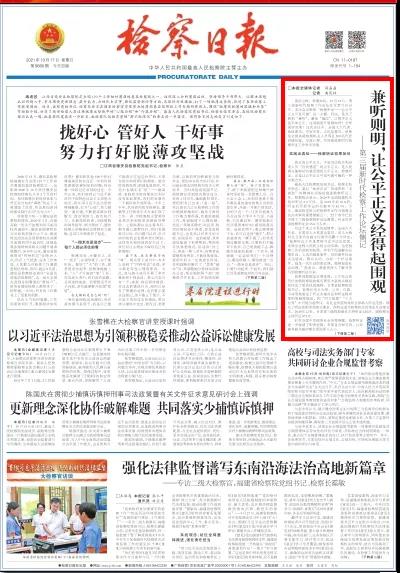 2021年10月18日,检察日报头版刊发新闻《兼听则明,让公平正义经得起围观——第三届新时代检察工作论坛侧记》。