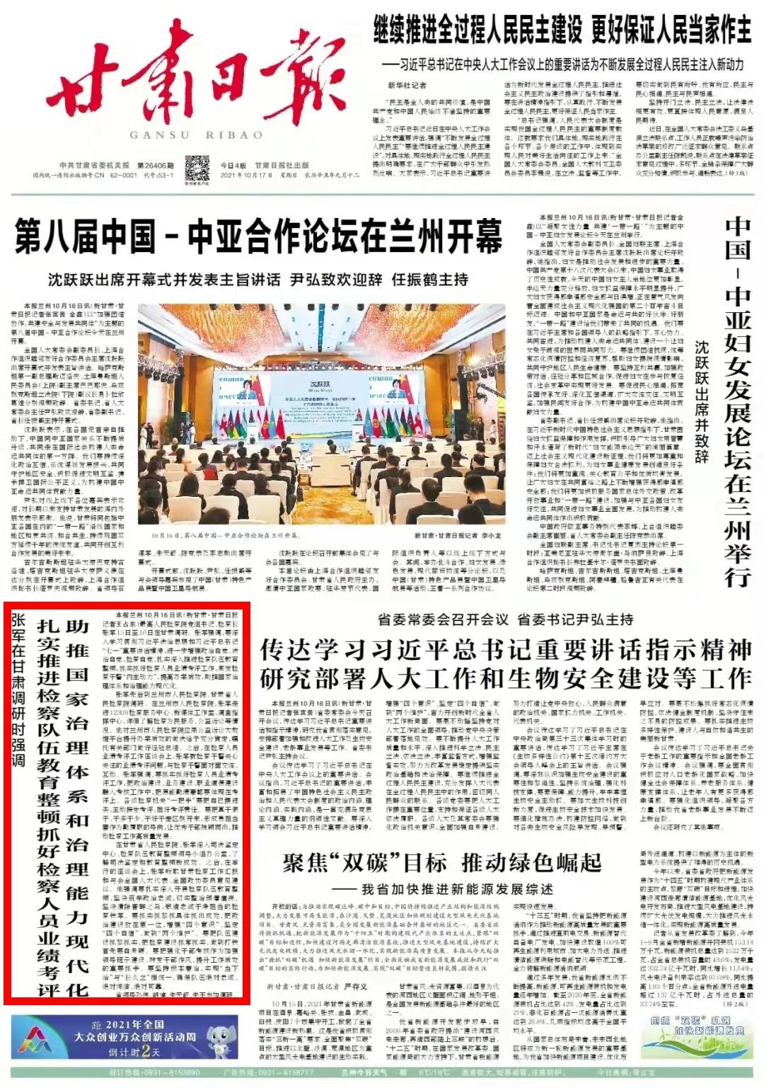 2021年10月17日,甘肃日报头版刊发新闻《张军在甘肃调研时强调 扎实推进检察队伍教育整顿抓好检察人员业绩考评 助推国家治理体系和治理能力现代化》。