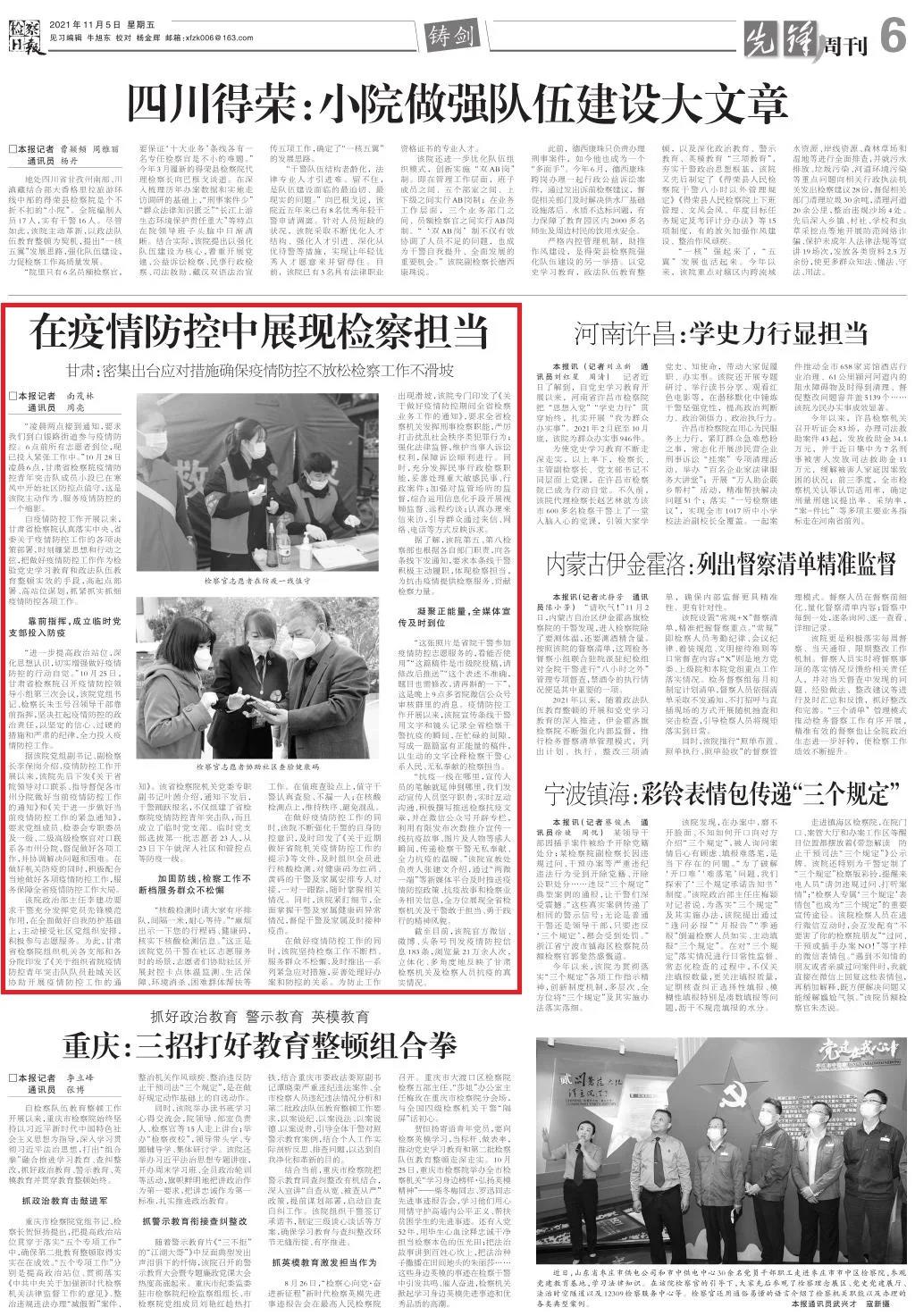 2021年11月5日,检察日报六版刊发《在疫情防控中展现检察担当——甘肃:密集出台应对措施确保疫情防控不放松检察工作不滑坡》。