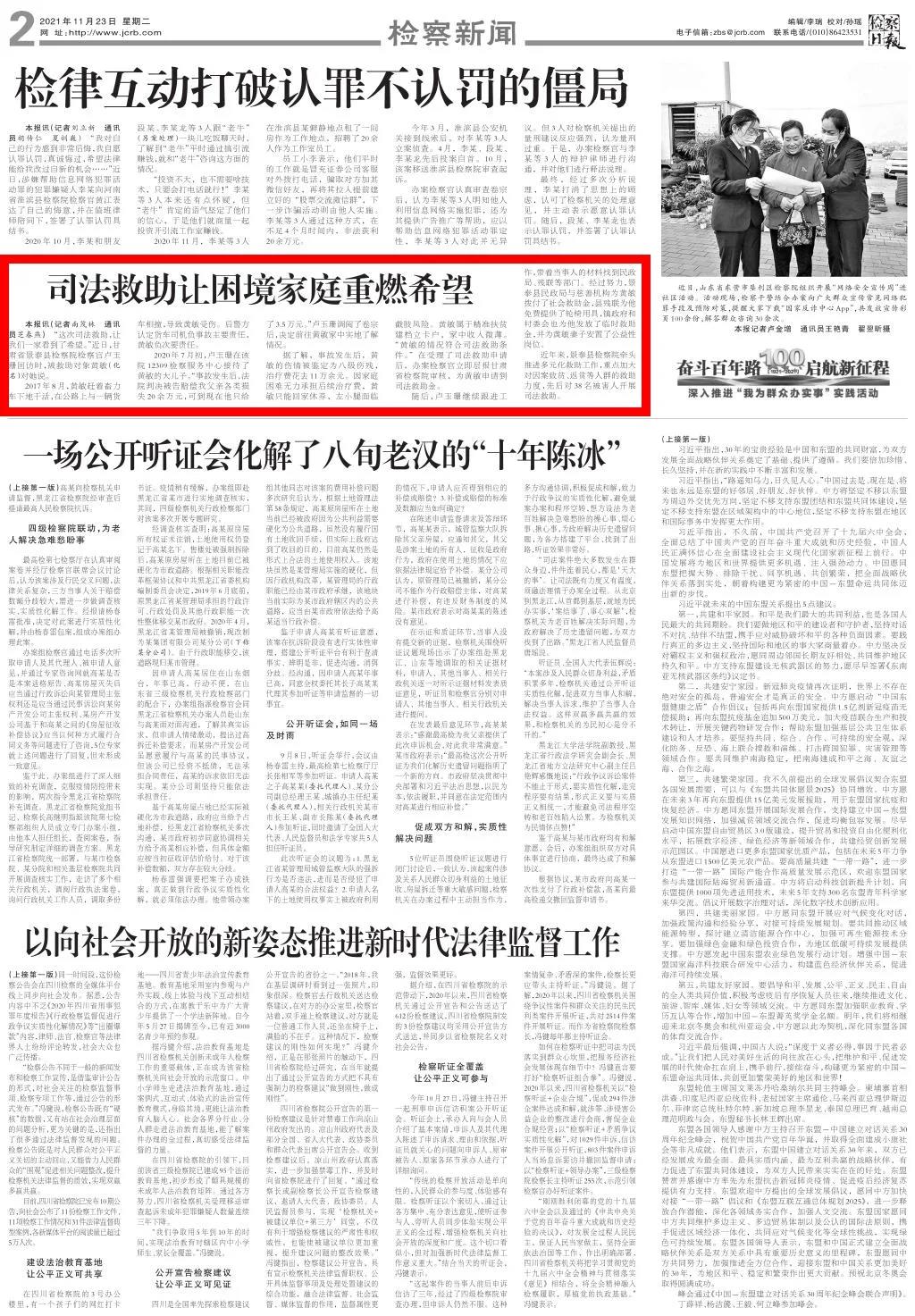 2021年11月23日,检察日报二版刊发《司法救助让困境家庭重燃希望》。