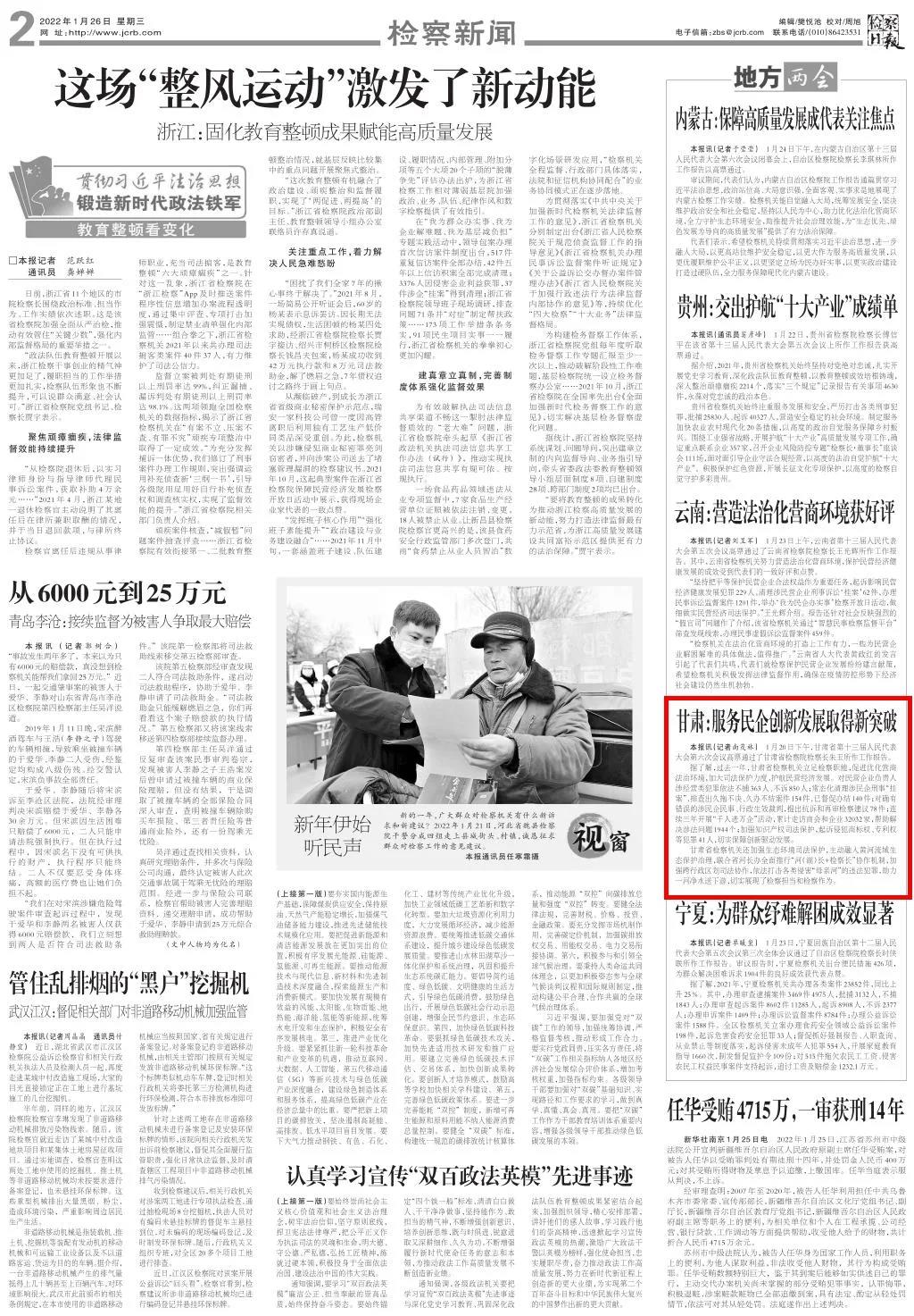 2022年1月26日,检察日报二版刊发《甘肃:服务民企创新发展取得新突破》。