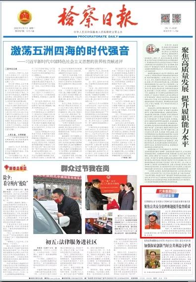 2022年2月7日,检察日报头版刊发《甘肃镜铁山矿业有限公司桦树沟矿区值班长谢生瑞代表:聚焦公共安全治理难题提升监督质效》。