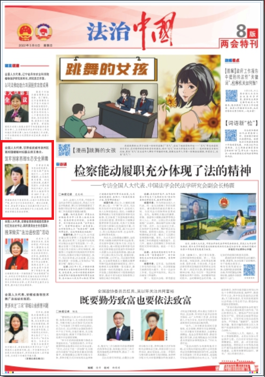 2022年3月6日检察日报八版刊发《全国人大代表、甘肃省武威市凉州区高坝镇蜻蜓村妇联主席王秀兰:筑牢国家西部生态安全屏障》。