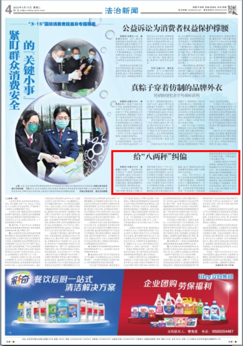 2022年3月15日检察日报四版“3·15”国际消费者权益日专题报道专栏刊发《给“八两秤”纠偏》。
